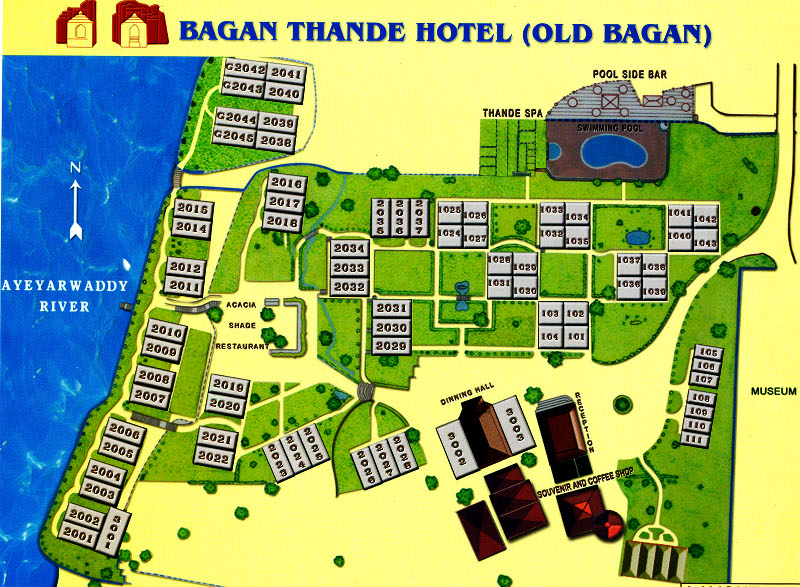 Located at the South West corner of Old Bagan at the Eastern bank of Ayeyawaddy river. 32 Riverview Deluxe rooms, 12 Garden View Deluxe Rooms, 2 Ayeyarwaddy River Suites, 20 Superior Rooms, and 1 two-storey 1922 suite.