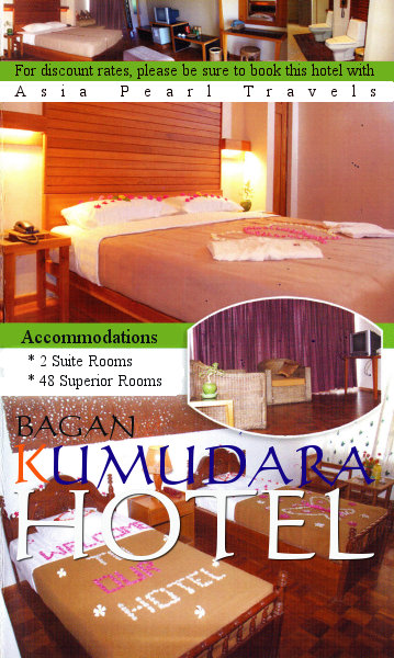 Amazing Bagan Resort Hotel | Arthawka Hotel | Aye Yar River View Hotel | Bagan Hotel, River View | Bagan Thande Hotel | Kaday Aung Hotel | Kumudara Hotel | Pagoda City Hotel | Thazin Garden Hotel | The Hotel @ Tharaba Gate | Thiripyitsaya Sanctuary Resort |