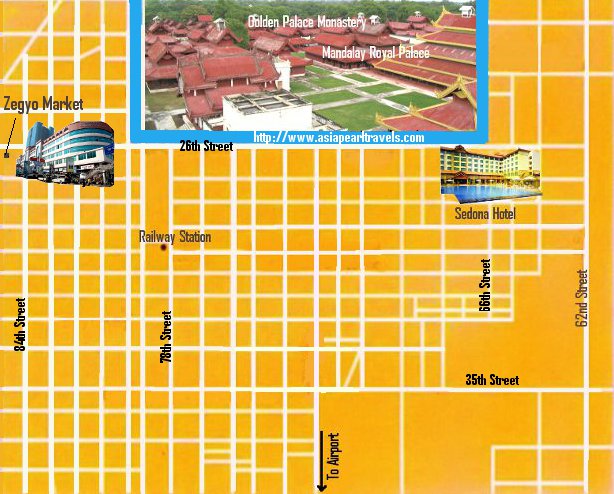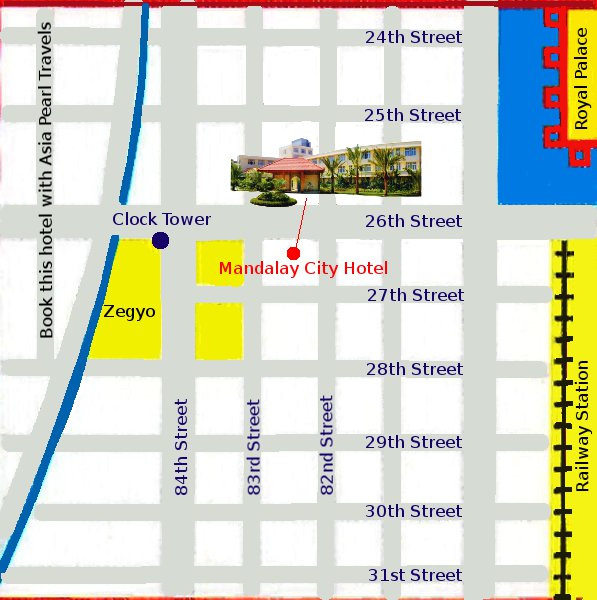 Located at the junction of 37th street & 83rd. street in downtown Mandalay Business District right next to Zegyo Market and Night Bazaar, and 10 minutes walk to Railway Station.
