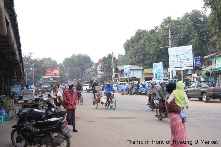 [See traffic in front of Nyaung U Market | Myanmar Handicrafts in Nyaung U Market ]