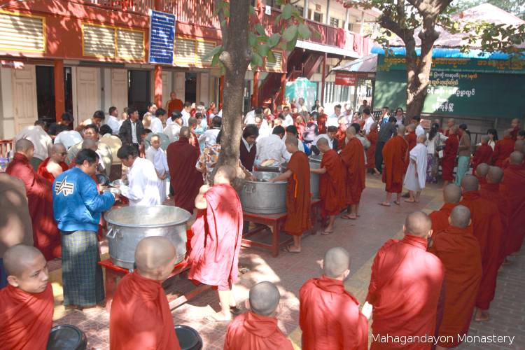 Observe the daily lunch offering to hundreds of Buddhist monks in Mahagandayon Monastery as they are being photographed by almost equal number of tourists.