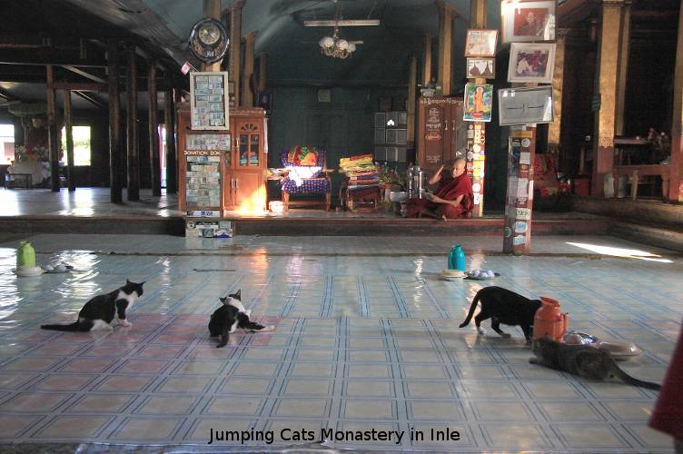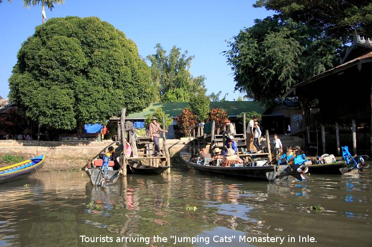 [ See tourists arriving "Jumping Cats" Monastery in Inle.]