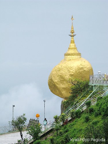 The Kyaikhtiyo Pagoda is 7.3 meters high, and built on a gold-gilded boulder 25 meters in circumference. This strange piece of rock has been sitting at the edge of the ridge for ages; nobody knows for sure how it got to be in this precarious position in the first place.