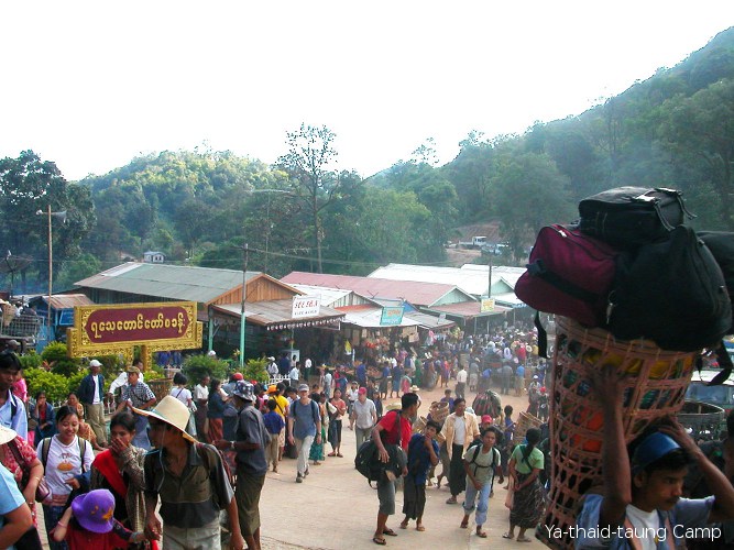 [See pilgrims and visitors walking up to Kyaikhtiyo Pagoda from Ya-thaid-taung Camp.]