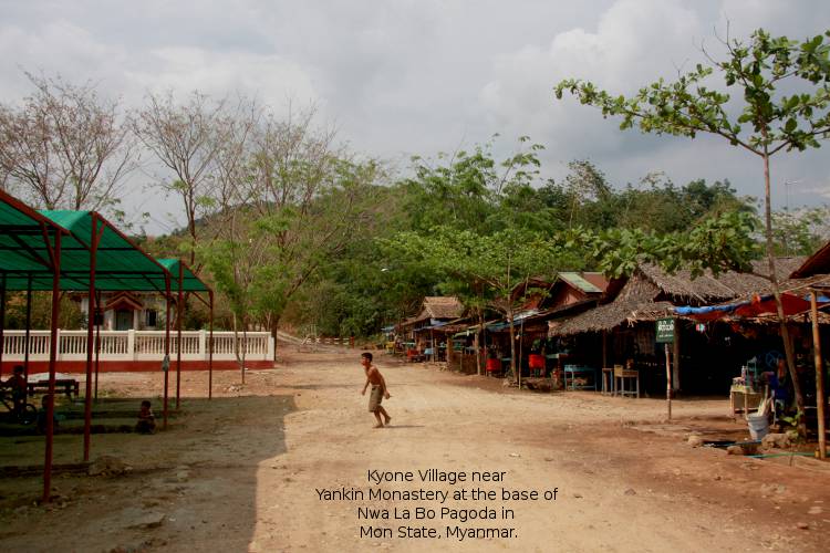 It is located in Mon state, Poun township, Kyone village, 4 miles up from Yankin Monastery at the base of Nwa La Bo mountain. You can go all the way up to the base of the rock either on foot along the trail under the shades of the trees and shadow of the mountain, or by trucks from the Yangon-Malamyine Highway all year around. There are festivities every year during the Thingyan period (around mid April).