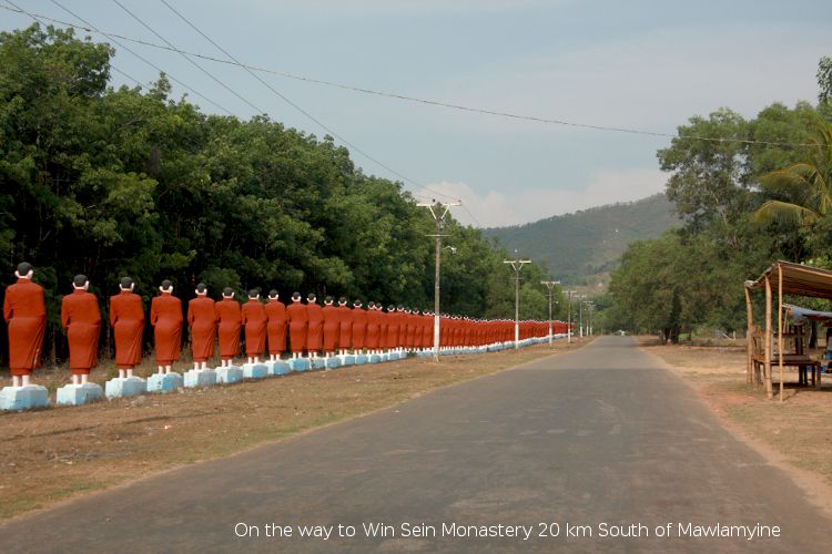 [See statues of 100 monks going for alms along the road side leading to Win Sein Taw Ya]